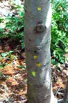 군데군데 껍질을 벗긴 부분이 나무좀 가해 부위