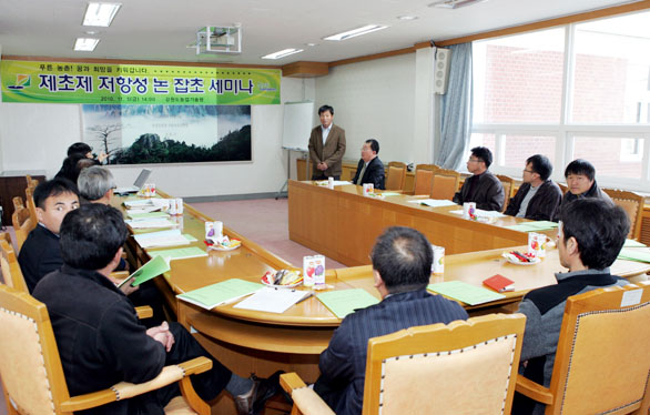 강원도농업기술원(원장 안중찬) 에서는 제초제 저항성을 갖는 논 잡초의 체계적 방제방안을 모색하기 위하여 11월 5일 농업기술원에서 농촌진흥청 및 시군농업기술센터 관계공무원 등 30여명이 참석한 가운데「제초제 저항성 논 잡초 세미나」를 개최하였다.
