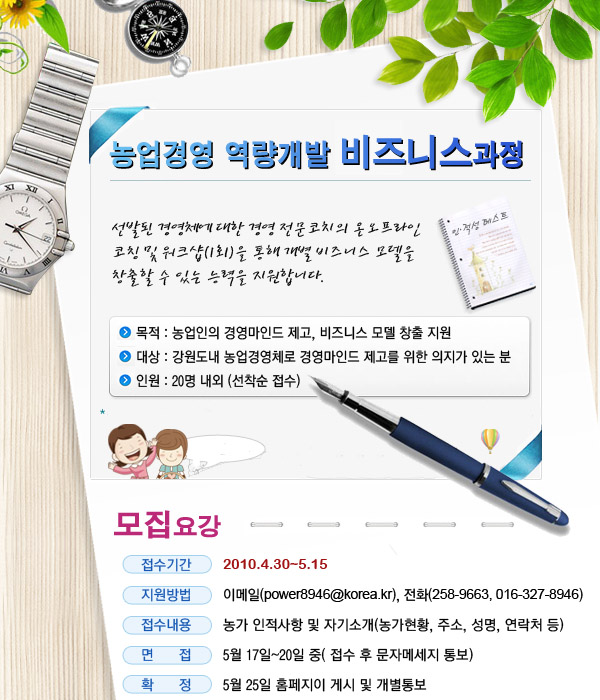 | 234 | 농업경영 역량개발을 위한 비즈니스과정 모집 | 작물경영연구과 | 2010-04-27 | 6015 | |