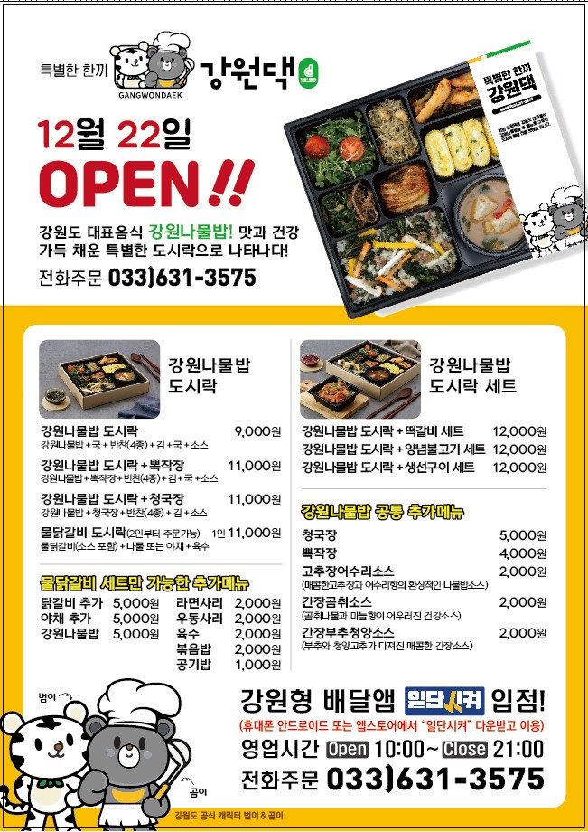 | 1296 | 강원나물밥 배달 도시락「강원댁」속초에서 출시 | 관리자 | 2020-12-21 | 923 | |