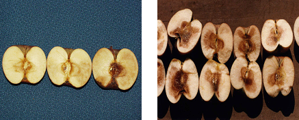 그림 1. 사과 후지 품종의 저온저장 중 발생되는 내부갈변과 증상