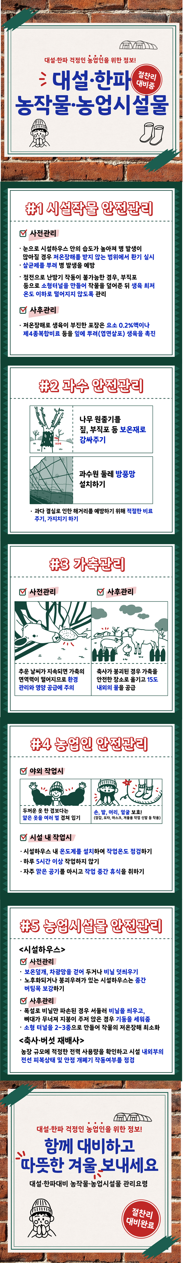 | 1 | 대설 한파 걱정인 농업인을 위한 정보 | 관리자 | 2021-01-07 | 632 |