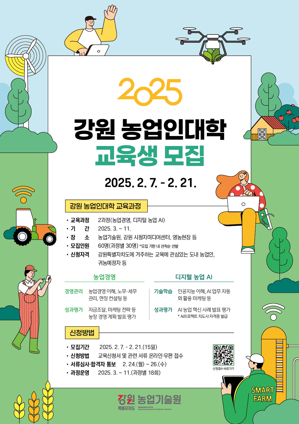 | 78 | ★ 2025년도 강원 농업인대학 모집 공고 ★ | 관리자 | 2025-02-06 | 1611 | |