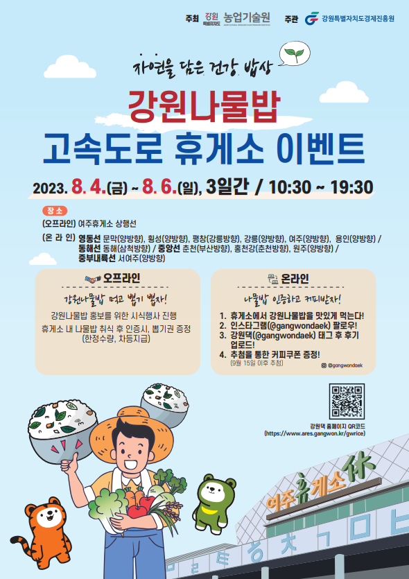 | 1790 | 강원나물밥, 휴가철 휴게소 홍보행사 열어 | 관리자 | 2023-08-03 | 293 | |