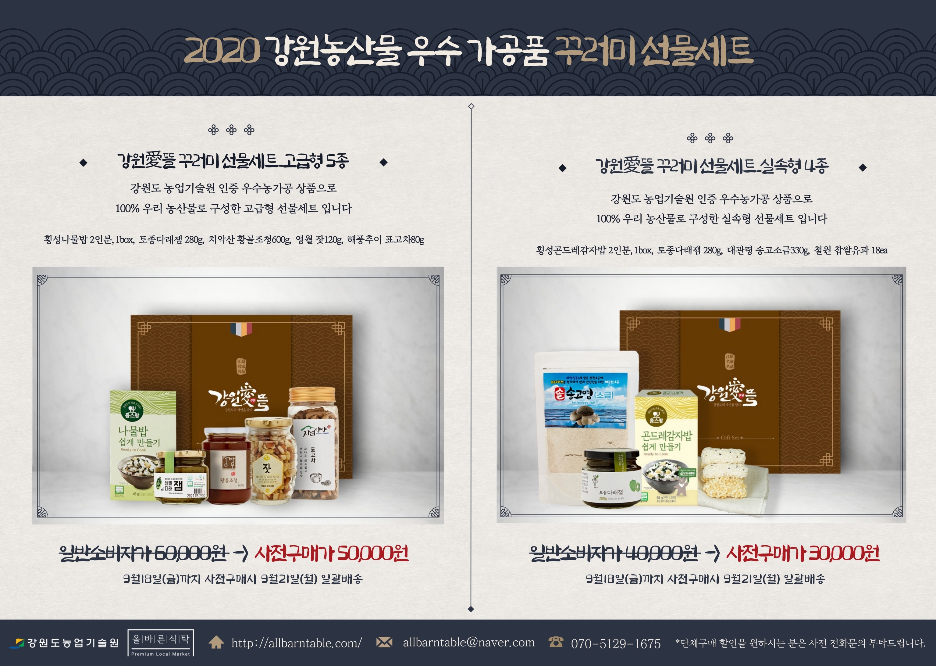| 1244 | 우수 농가공품 강원애뜰 꾸러미세트 출시 | 관리자 | 2020-09-09 | 1104 | |