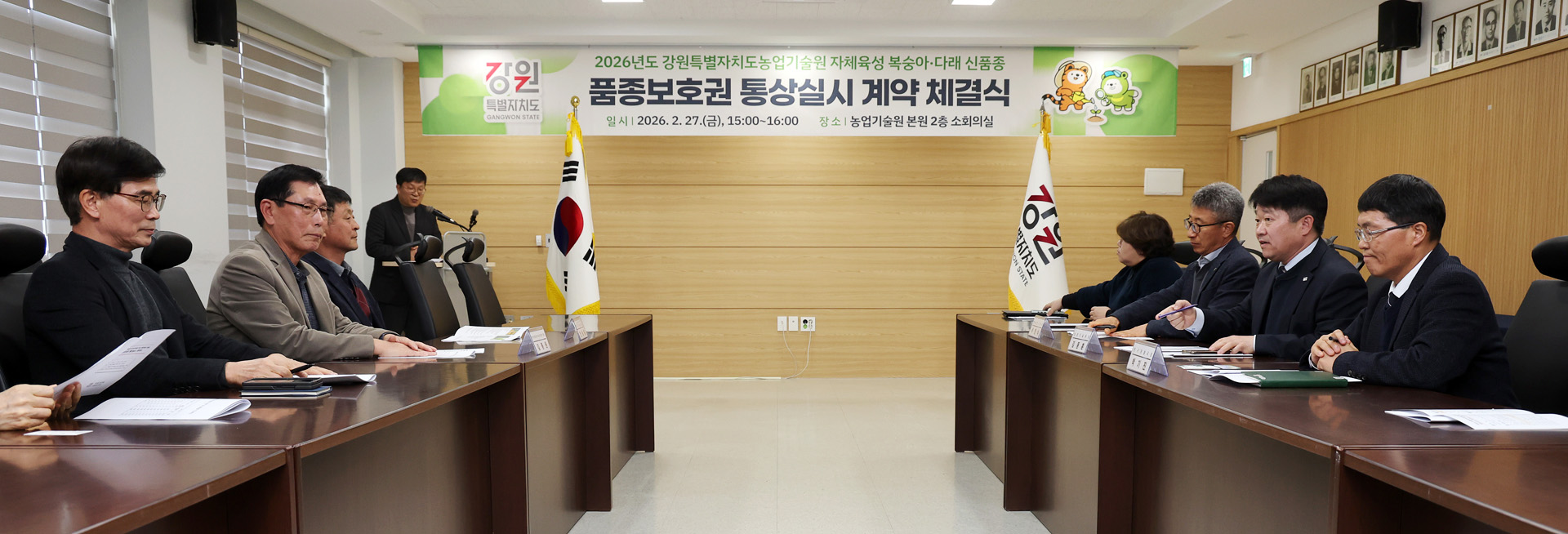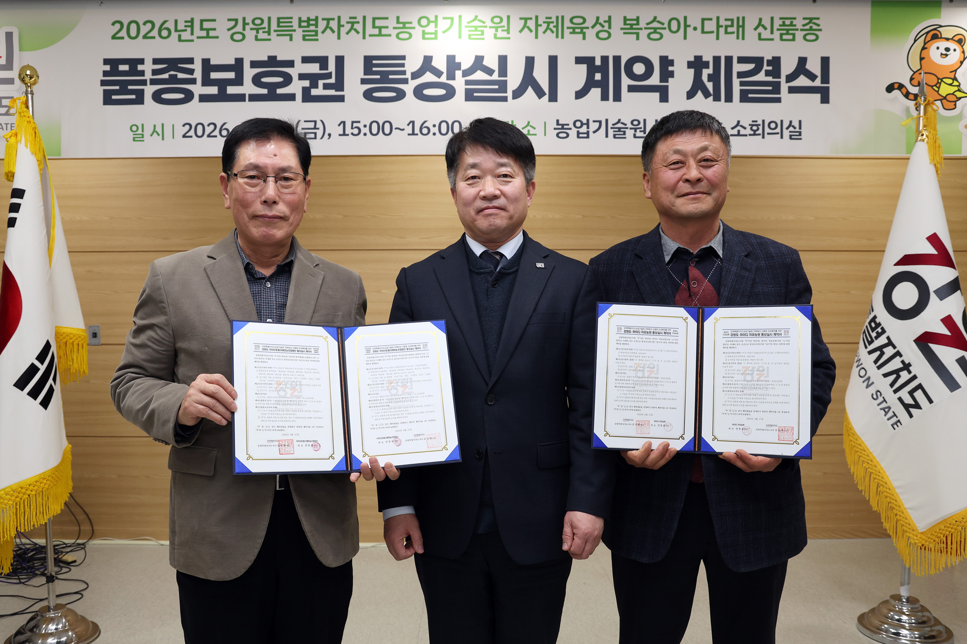 강원특별자치도 농업기술원(원장 김동훈)은 자체 육성한 과수 신품종의 농가 보급 확대를 위하여 2월 27일(금), 본원에서 복숭아와 다래 신품종에 대한 품종보호권 통상실시 계약을 체결했다.